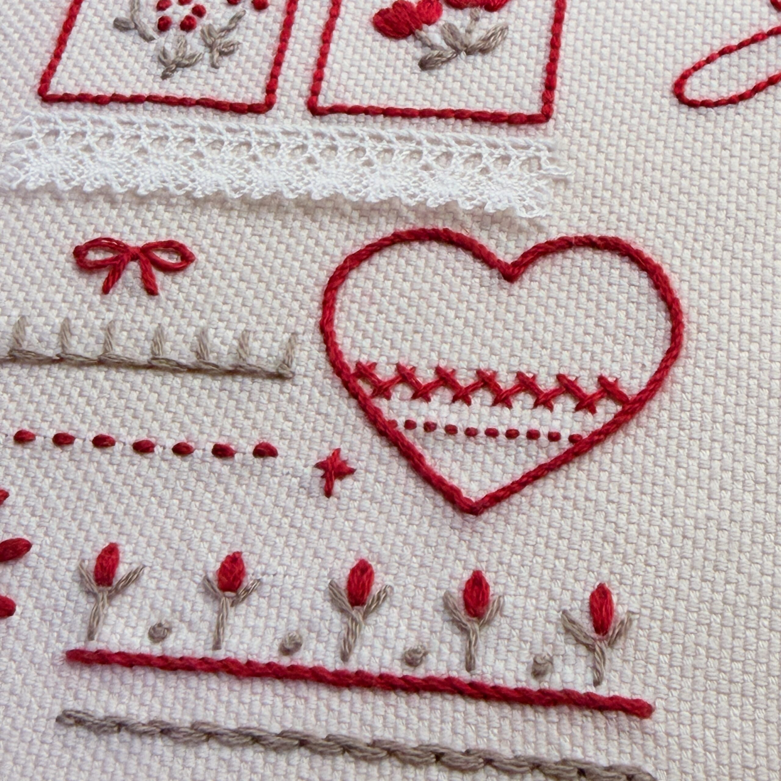 赤を基調にしたデザインの中に、フランス刺繍の基本ステッチを16種類盛り込んでいます♡