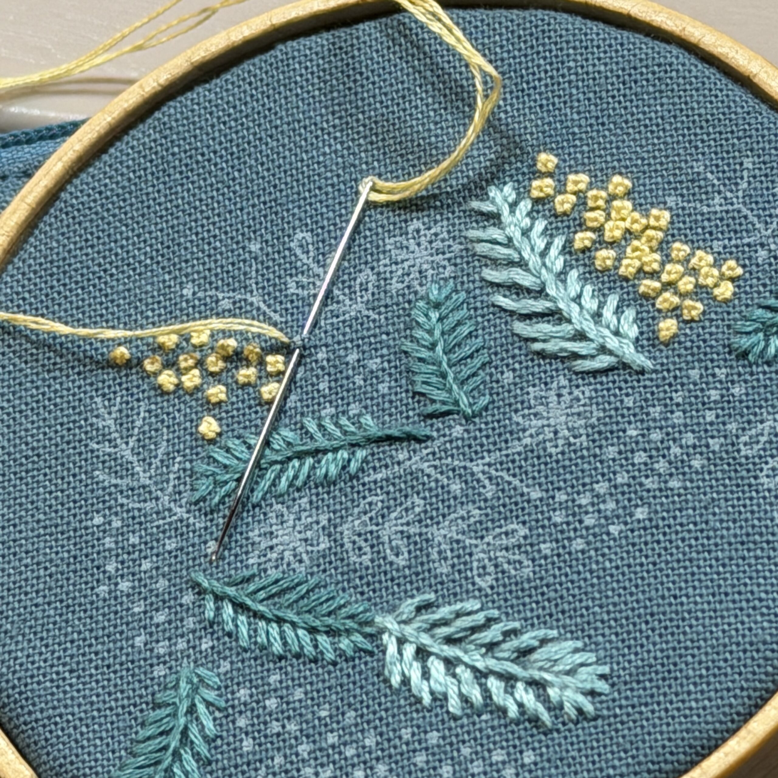 少し布目の荒いリネンに刺しているため、針は細いものを選び、